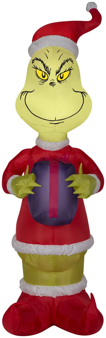 Deck the yard with an Airblown Inflatable Grinch holding a present! Dressed for the season in a Santa suit, our Grinch inflatable makes an eye-catching addition to your outdoor Christmas decorations. Setup is super simple. Just plug it in, stake it down and watch the magic unfold. Display this whimsical holiday decoration as a standalone or combine it with other Airblown Inflatables to create a custom scene. Includes everything needed for easy outdoor setup.