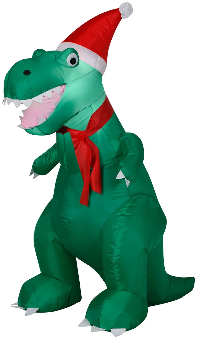 Celebrate the season with an Airblown Inflatable T-Rex wearing a Santa hat and matching scarf! This charming dinosaur inflatable makes an eye-catching addition to your outdoor holiday decorations. Setup is super simple. Just plug it in, stake it down and watch the magic unfold. Display this whimsical T-Rex inflatable as a standalone or combine it with other Airblown characters to create a custom scene. Includes everything needed for easy outdoor setup.