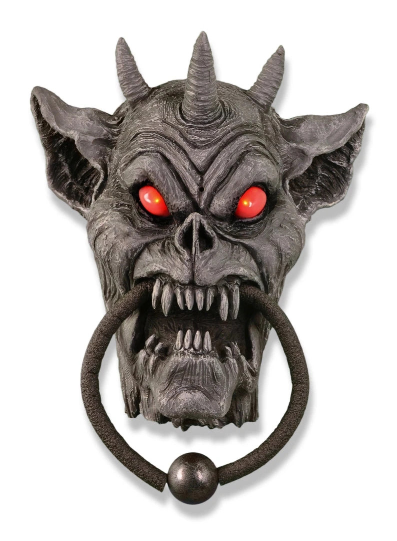 This spooky gargoyle door knocker says two demented phrases as its mouth moves and eyes glow red!Â