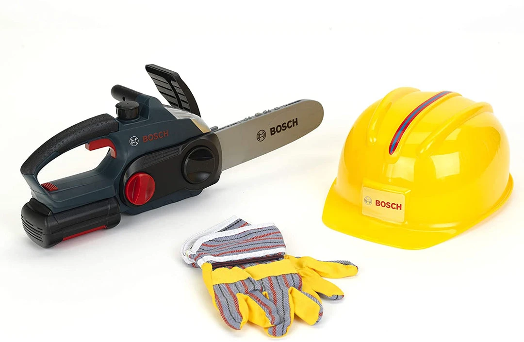 Bosch Worker Set consisting of Bosch chain saw with realistic sawing sound and flashlight, Bosch work gloves in a standard size, and Bosch helmet with adjustable size.